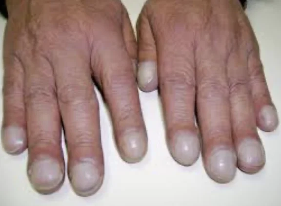 Trommelschlegelfinger sind kolbenförmig verdickte Fingerendglieder. Die Fingernägel wirken dabei rund gewölbt und vergrößert (Uhrglasnägel).