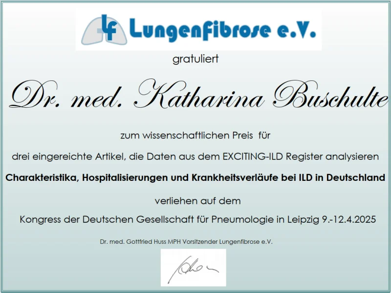 Die Zuerkennung des diesjährigen Preises erhält sie für Ihre Analysen aus dem EXCITING-ILD Register. Mit diesen Daten konnte sie die Fachjury aus dem Beirat und dem Vorstand des Vereins Lungenfibrose überzeugen, die mittlerweile in zwei sehr schönen Publikationen in internationalen Journalen gemündet sind, eine dritte ist eingereicht.